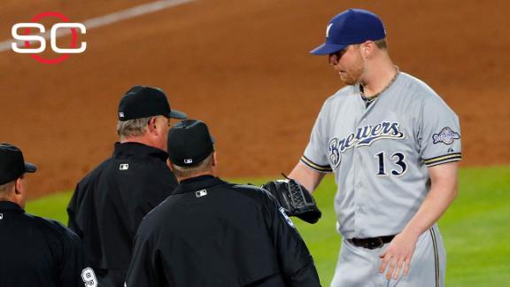 With the bases loaded and one out and Atlanta leading 2-1, Braves manager Fredi Gonzalez emerged from the dugout and asked the umpires to check whether Smith had pine tar on his arm.
