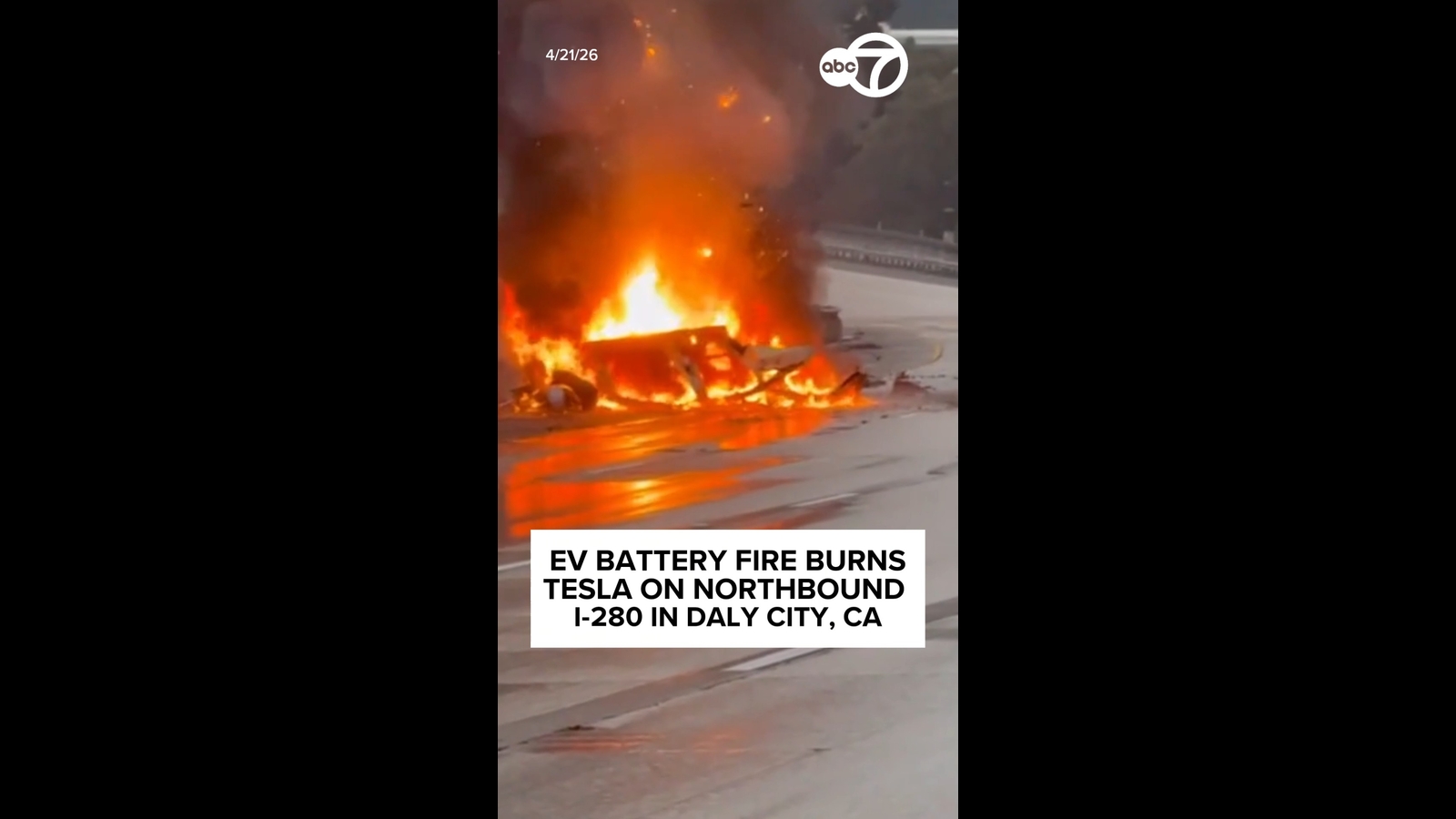 Battery fire engulfs Tesla on I-280 in Daly City, CA after crash